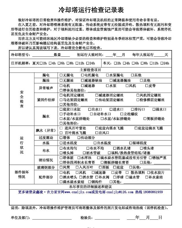 當(dāng)然,對在質(zhì)保期內(nèi)的冷卻塔,建議用戶盡量與制造商及經(jīng)銷商保持聯(lián)系,查看使用說明書與維護(hù)保養(yǎng)手冊,對在夏天與秋老虎天氣中沒有解決的問題也可以要求廠家作進(jìn)一步診斷和優(yōu)化升級。而過了質(zhì)保期的冷卻塔,制造商及經(jīng)銷商確實(shí)排不出時(shí)間的話,****可以免費(fèi)咨詢本公司或按以下表格進(jìn)行初步檢查。